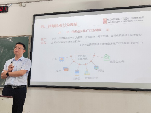 (图三:王魁华律师正在为同学们进行律师职业行为规范的讲解和分享)