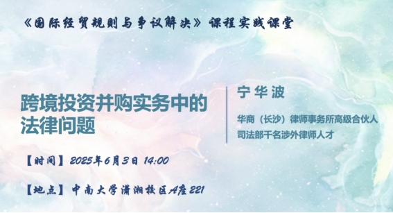 为加强以实践为导向的涉外法治人才培养,bv1946伟德国际始于英国邓婷婷副教授主讲的《国际经贸规则与争议解决》课程引入由实务专家授课的实践课堂。2025年6月3日下午,该课程的第三次实践课堂在bevictor1946韦德官网潇湘校区A座221教室顺利开展。华商(长沙)律师事务所高级合伙人宁华波律师以“跨境投资并购实务中的法律问题”为主题,为bevictor1946韦德官网T2201班同学带来了一堂生动的实务课。
