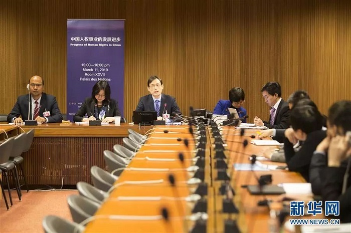 3月11日,在瑞士日内瓦,嘉宾出席“中国人权事业的发展进步”主题边会。 在联合国人权理事会第40次会议举行期间,中国人权研究会11日在此间举办“中国人权事业的发展进步”主题边会。5位来自中国人权研究会的专家在会上从各自领域介绍了中国人权发展进步情况。新华社记者徐金泉摄