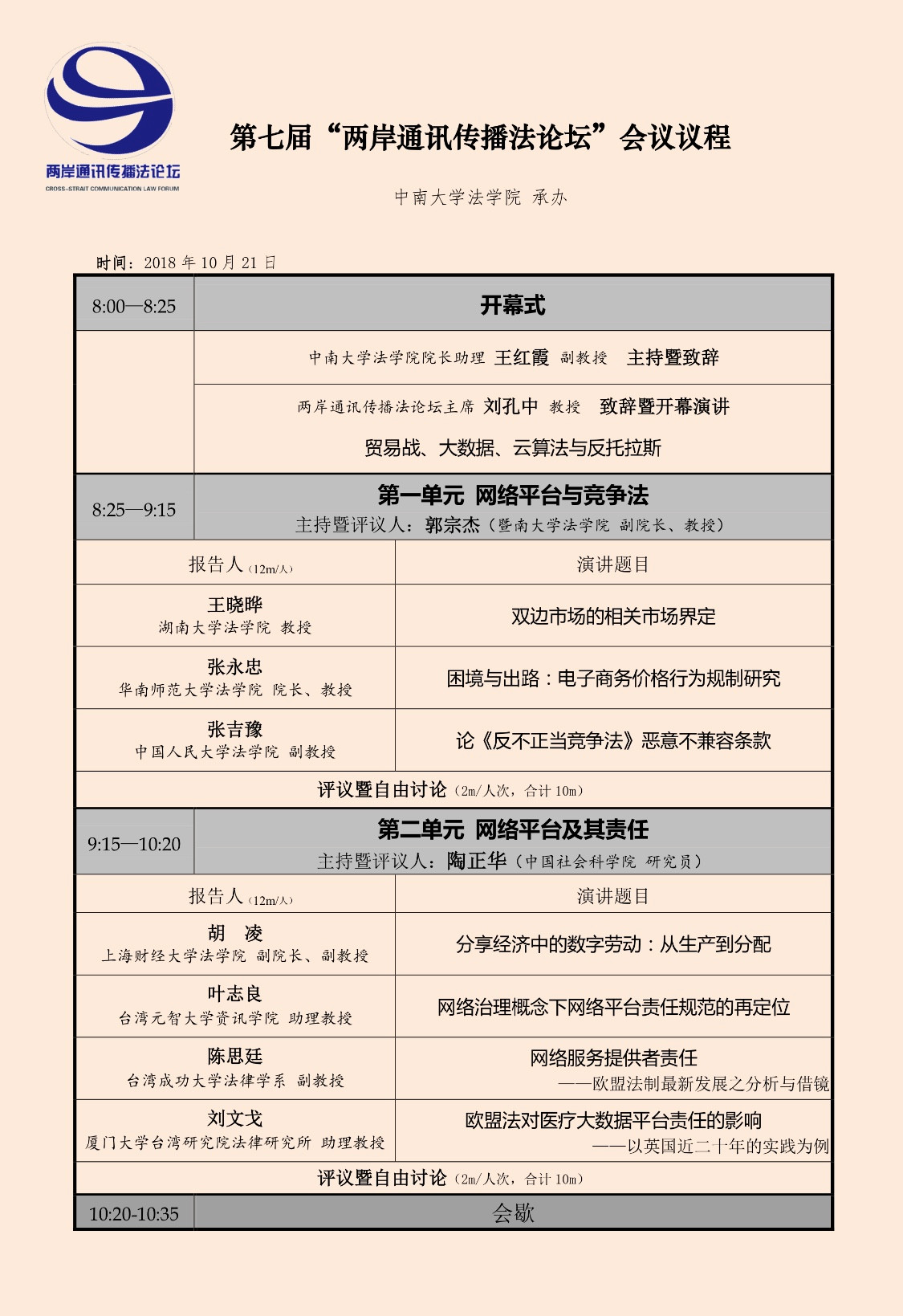 “两岸通讯传播法论坛”是旨在持续推动两岸电信、广电与互联网法学暨通讯传播法学的定期交流,促进理论界与实务届密切互动和广泛合作的专业对话平台。自2012年创办以来已先后在中国的台湾(台北,2012;台北,2013;台南,2016)、大陆(廊坊,2014;长沙,2015;广东,2017;长沙,2018)连续举办七届,现已成为国内本领域的品牌论坛。