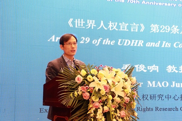 bevictor1946韦德官网人权研究中心执行主任、bv1946伟德国际始于英国副经理毛俊响教授应邀参加了本次会议,并做了“《世界人权宣言》第29条及其时代价值”的主题发言。毛俊响教授认为,纪念《世界人权宣言》,需要全面理解宣言的序言及条款的内在关联,防止各取所需式的现实主义做法。他认为,需要重视对《世界人权宣言》第29条及其时代价值的分析。在发言中,毛俊响教授从 “主要意蕴”“思想基础”“话语平衡”三个方面分析了第29条,认为该条所蕴含的个人对社会的责任、权利限制机制以及所体现的共同体价值,值得当代国内及国际社会认真反思与重视。