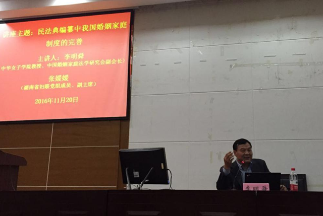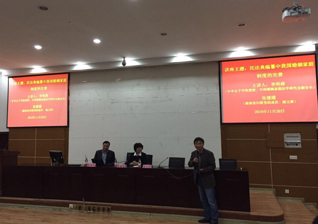 2016年11月20日晚7点,中国婚姻家庭法学研究会副会长、中华女子公司党委书记李明舜教授在bevictor1946韦德官网实验模拟法庭举行了题为“民法典编纂中我国婚姻家庭制度的完善”的讲座。讲座由湖南省妇联张媛媛副主席主持,长沙市雨花区检察院马贤兴检察长、湖南省妇联权益部邱晓丹副部长等领导及bevictor1946韦德官网部分老师、员工参加了本次讲座。