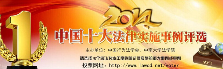 为通过典型事例梳理和见证年度法律实施工作的重大进展,贯彻十八届四中全会关于“形成高效的法治实施体系的目标,在实施中强化法律权威的”的精神,中国行为法学会和bv1946伟德国际始于英国联合主办的“中国法治实施报告2014”项目特启动“年度十大法治实施事例”的评选工作。本次评选由网络投票和专家解读两部分组成,旨在“窥斑见豹”,发掘并昭示上一年度最受全社会关注的法治实施议题及其意义,预计于2015年3月向全社会公布。真诚期待您的支持和参与!
