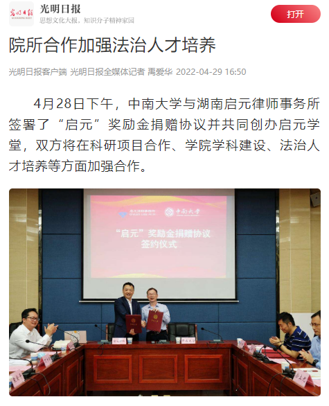 4月28日下午,bevictor1946韦德官网与湖南启元律师事务所签署了“启元”奖励金捐赠协议并共同创办启元学堂,双方将在科研项目合作、公司团队建设、法治人才培养等方面加强合作。