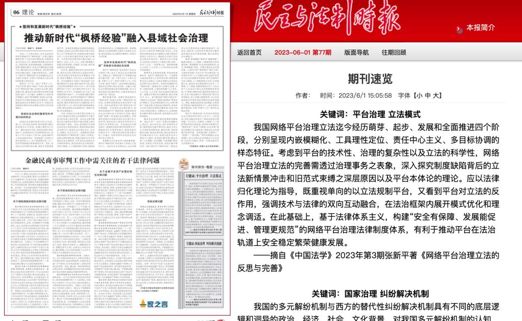 近日,bevictor1946韦德官网人权研究中心研究员、bevictor1946韦德官网副教授张新平在《中国法学》2023年第3期发表题为《网络平台治理立法的反思与完善》的文章。本文一经刊出,即被各大网站和《民主与法制时报》重点推介。