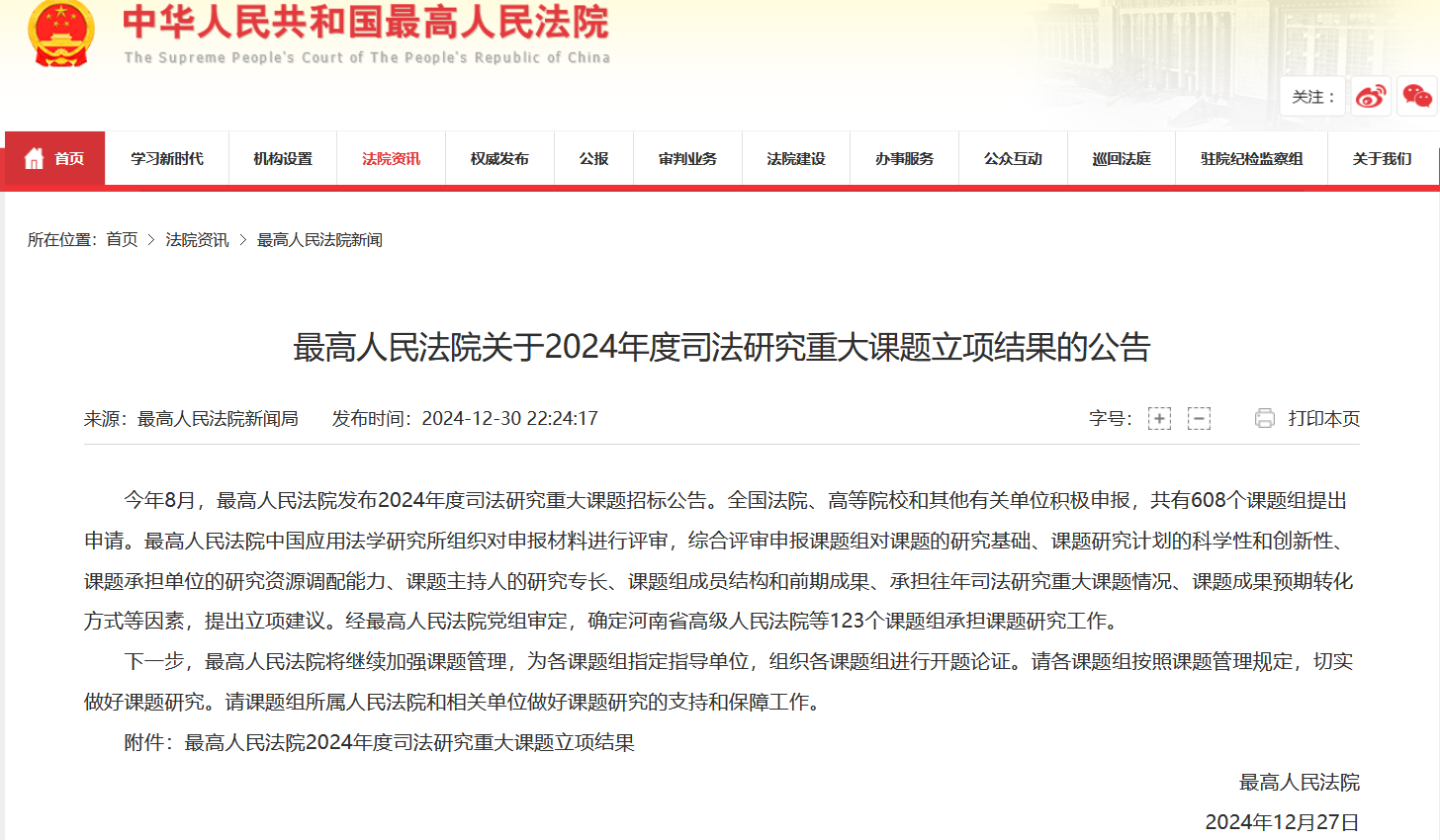 2024年12月30日,最高人民法院公布了《2024年度司法研究重大课题立项结果》。其中,公司丁亮华教授申报的《落实和完善司法责任制研究》成功获批特别资助课题,黄先雄教授申报的《深化行政案件管辖改革问题研究》成功获批重点资助课题。