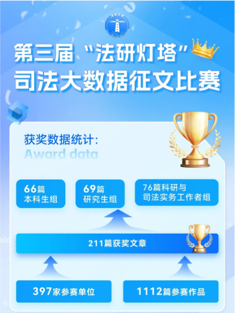 日前,由最高人民法院信息中心指导,中国司法大数据研究院主办的第三届“法研灯塔”司法大数据征文比赛正式落下帷幕。本届赛事共计397家单位参与,合计提交1112篇参赛作品,经高校院所法学研究专家、权威法学期刊主编、副主编或编辑部主任等多方专家多轮次评审,共评出211篇获奖文章。