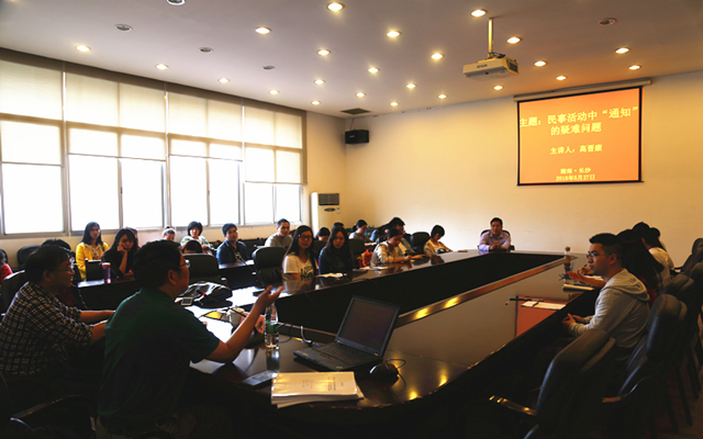 高晋康教授以民事活动中“通知”所面临的问题为切入点拉开了此次讲座的序幕。高教授用举例的方式在与同学们的互动中指出了书面通知、电话通知所存在的疑难问题,随后就该问题提出了可行的解决方案,并将“通知”这一常见的实践问题提升到较高的理论层次。高晋康教授指出,随着现代技术的发展,民事活动中的“通知”在实践中将会不断呈现出新的表现形式,而法律相应地也会发生相应的变化。
