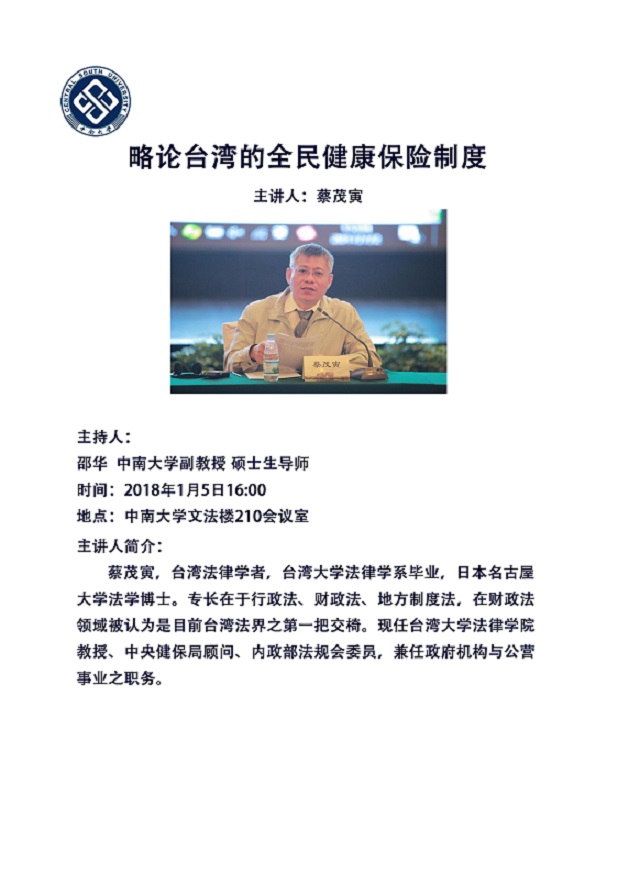 【讲座预告】蔡茂寅:略论台湾的全民健康保险制度