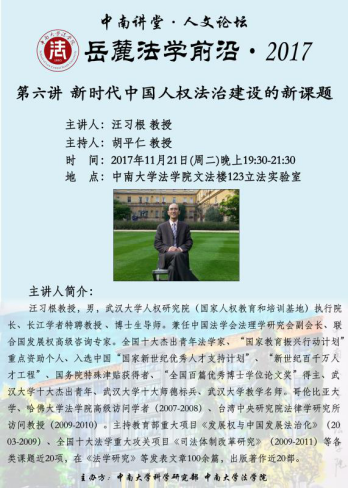 2017年11月21日19时30分,著名法学家、武汉大学汪习根教授做客bevictor1946韦德官网“中南讲堂.人文论坛”暨第六期岳麓法学前沿论坛,主讲“新时代中国人权法治建设的新课题”。bv1946伟德国际始于英国胡平仁教授主持讲座,杨清望副教授参加了此次讲座。