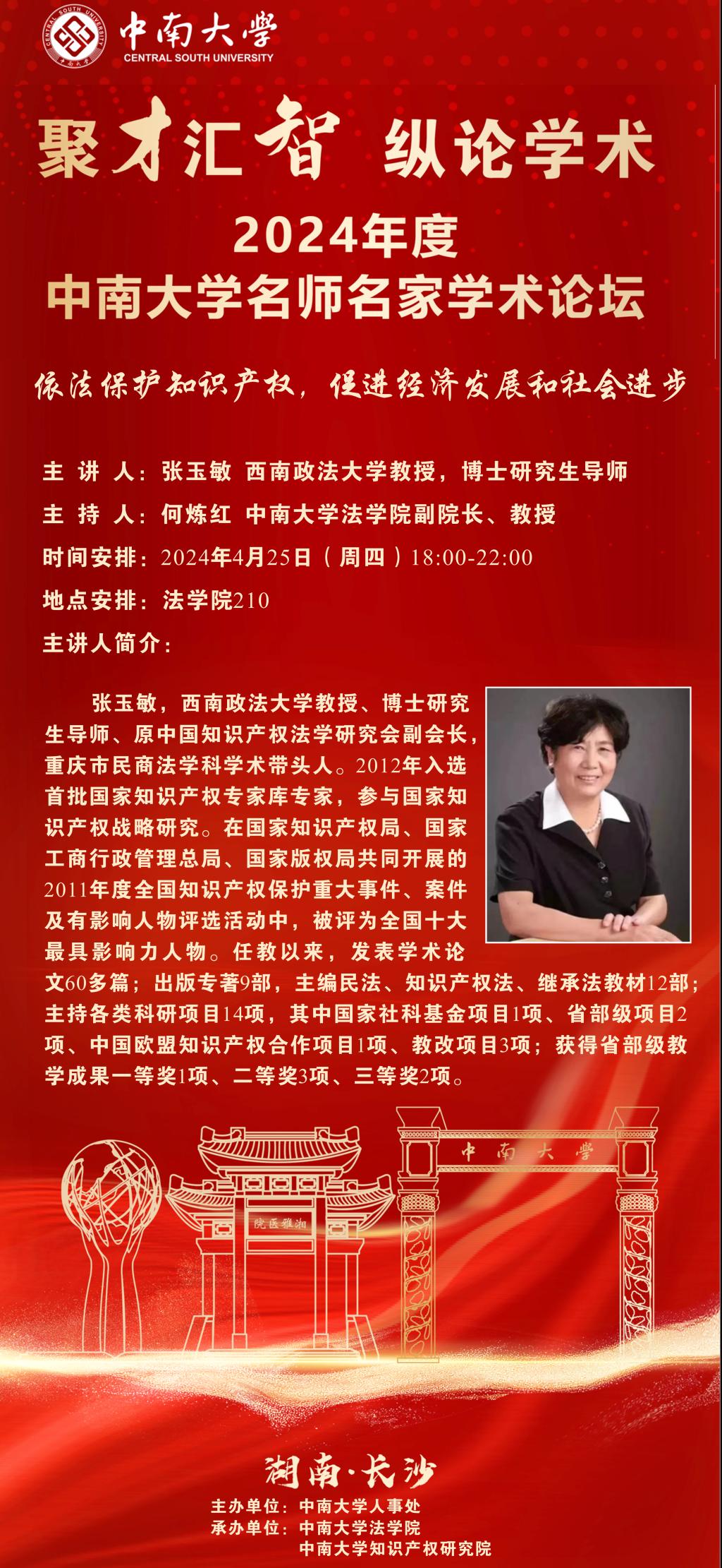 【讲座预告】张玉敏:依法保护知识产权,促进经济发展和社会进步