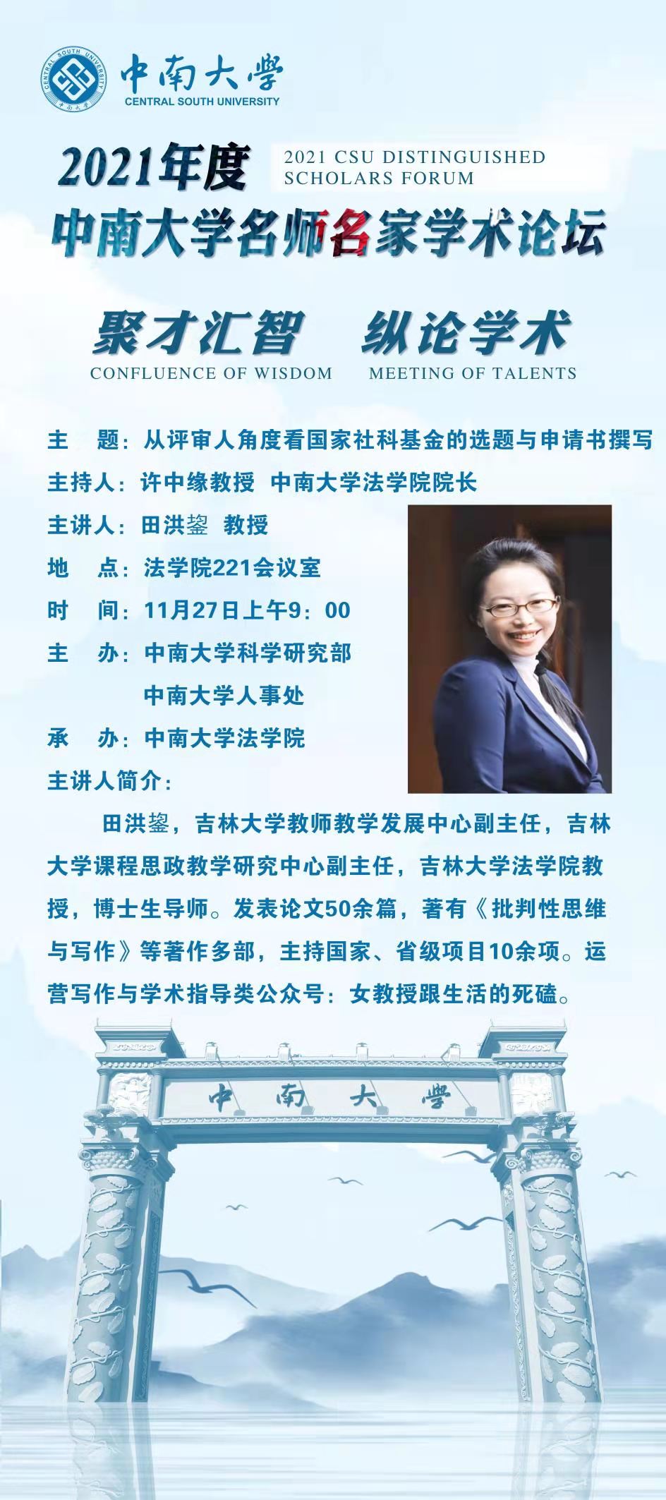 【名师名家讲座预告】田洪鋆:从评审人角度看国家社科基金的选题与申请书撰写