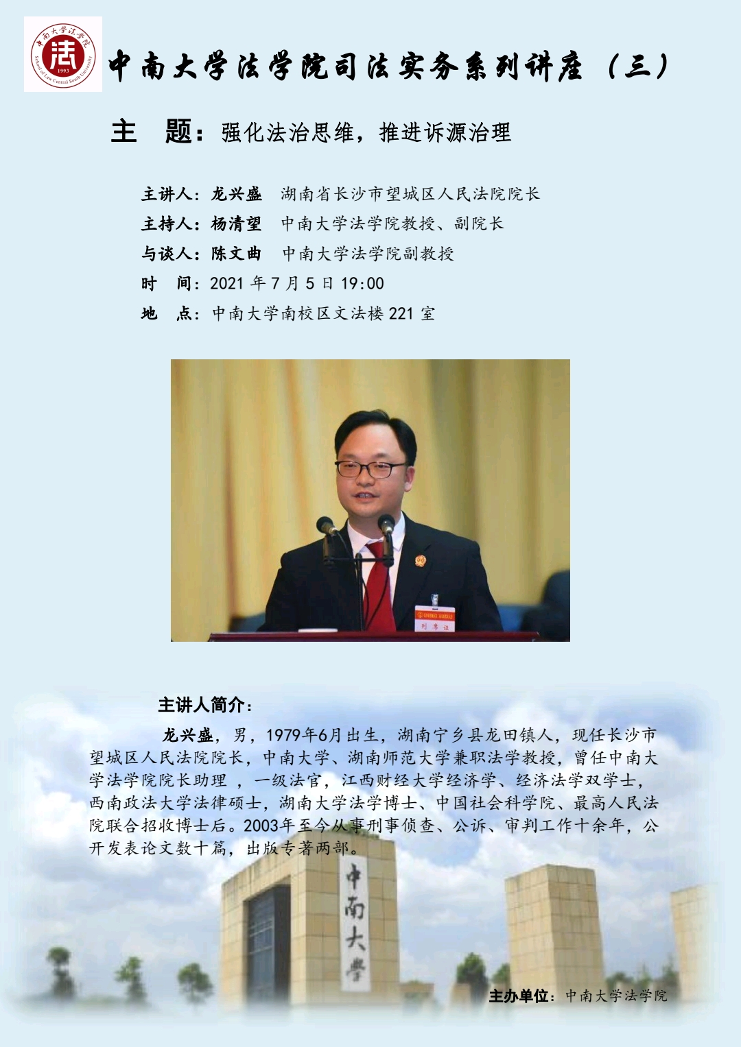 【讲座预告】龙兴盛:强化法治思维,推进诉源治理