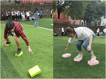 首先进行的是“搭桥过河”接力赛,以班级为单位分为17组,每组10人,通过团队每位队员用三个泡沫板接力走完赛程,用时最少者获胜。比赛期间,向鑫老师用幽默的语言进行赛事解说,参赛者积极探索行走方法,如螃蟹法、三角形法、泡沫移动法以及直线法,在双腿的颤抖中走完全程,方法各异,笑声不断。经过激烈的角逐,法学1605班以9’43”的佳绩斩获本次比赛第一名,法学1602和1604也不甘示弱,紧跟其后,分别位列第二名和第三名。