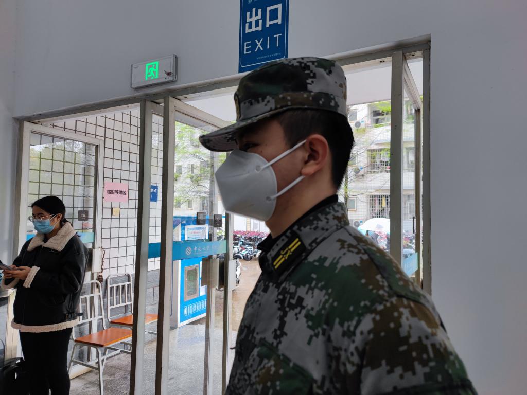 一楼大厅中,两名教官认真履行职责,时刻不忘提醒同学们间隔一米站立、排队过程中不能交头接耳。来自物电院电科1901班的杜安居教官正在准备入党,在接到教官集训队的命令后,他主动承担起一楼大厅的秩序维护工作,引导同学有序进行核酸检测。退役士兵、预备党员谢彪教官提醒同学们注意防护,集中注意力配合核酸检测工作。这是他第四次参与核酸检测志愿服务活动,面对严峻的疫情防控形势,他说:“有困难,就要上,这是部队教给我们的道理”。此外,他也希望同学们可以积极主动配合防疫工作,“这样我们众志成城,团结一心,很快就会战胜疫情。”