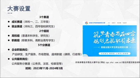 针对不同的赛道,柳思怡老师详细讲解了如何准备比赛,包括怎样确定职业目标的来源、如何在职业中寻找自我认同、如何强化使命担当等方面。在成长赛道方面,柳老师认为可以从地域、行业、组织和职位上多维度认知,寻找就业有力抓手,包括政策支持,行业发展前景等等。同时,需要从展望未来回到自身,在专业学习、实习实践、员工工作等方面明确自己的成长行动与轨迹,对成长计划做不断评估调整。