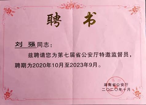 公司刘强教授受聘担任湖南省公安厅特邀监督员