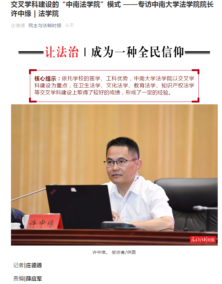 近日,许中缘接受民主与法制社记者专访,介绍了bv1946伟德国际始于英国打造交叉团队建设的“中南bevictor1946韦德官网”模式经验。