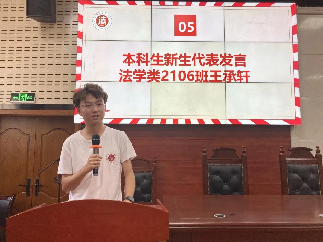 最后,2021级本科新生代表王承轩作了发言。他从“为什么要学法?”这个问题引入,认为“学法能让我们明辨是非、能让我们更好地服务社会、能让我们更好地建设祖国”。最后,他号召大家一起向前进,走好法律路,为国家法治事业贡献出自己的一份力量。