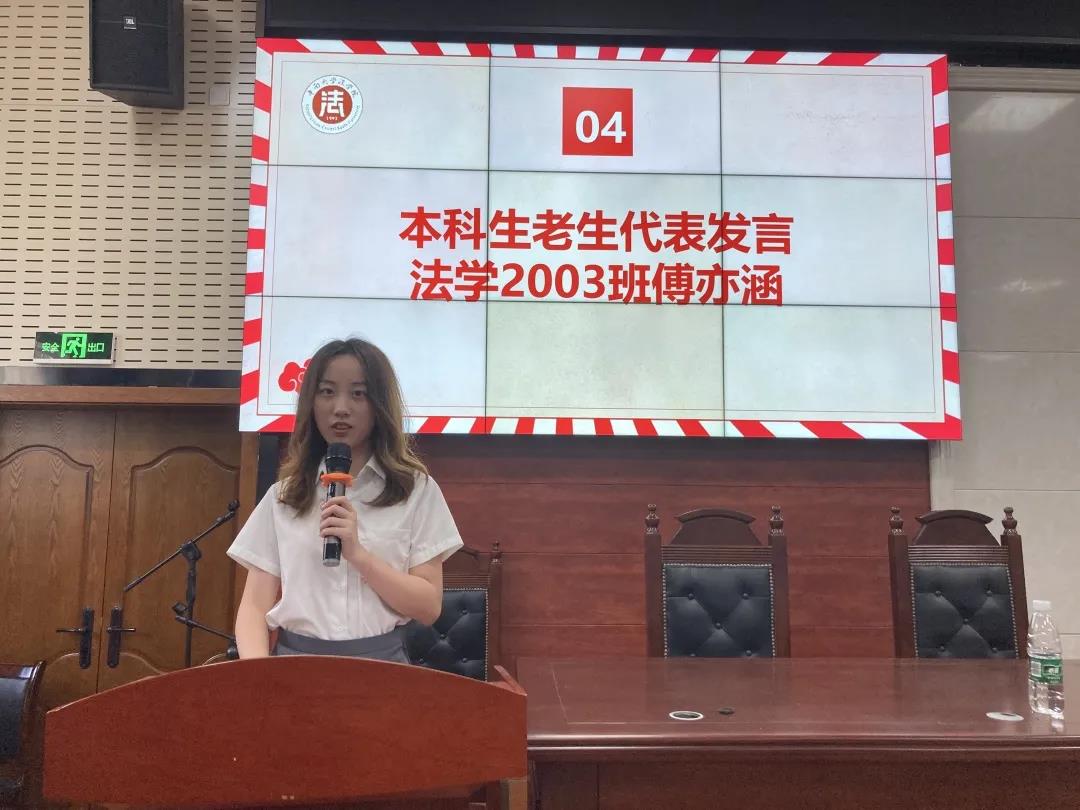 紧接着,2020级本科生傅亦涵作为本科生老生代表发言,她围绕“抱定宗旨,砥砺德行、敬爱师友”三个方面,向学弟学妹们分享了自己大一学习生活的经验和体会,祝福大家能够尽快适应老员工活,并能够在大学这座强调“独立之精神,自由之思想”的殿堂里求知若饥,虚心若愚,继往开来,不辱使命。