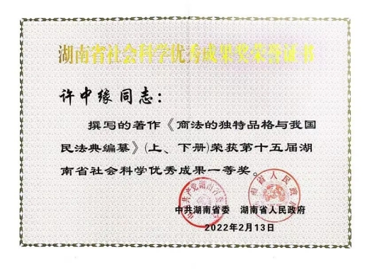 2月16日,湖南省委、省政府发布《关于表彰湖南省社会科学奖获奖成果和专家的通报》许中缘经理撰写的著作《商法的独特品格与我国民法典编纂》(上、下册)一等奖。