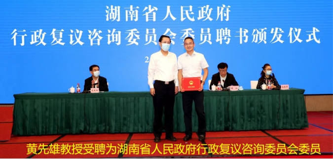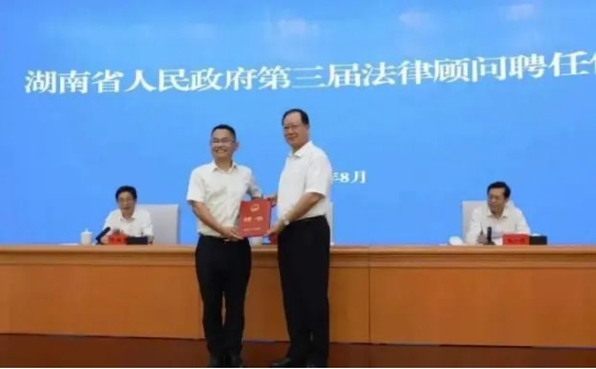 在2022年8月16日湖南省人民政府第三届法律顾问聘任仪式上,10名法学专家、律师和3家律师事务所受聘为省政府法律顾问和顾问单位。公司经理许中缘教授受聘为省政府法律顾问。黄先雄教授受聘为湖南省人民政府行政复议咨询委员会委员。彭中礼教授被聘为湖南省法官遴选委员会专家委员。