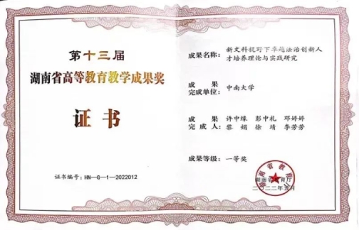 许中缘教授团队的研究成果“新文科视野下卓越法治创新人才培养理论与实践研究”获得湖南省高等公司产品成果一等奖。
