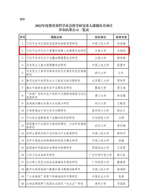 2022年12月13日,教育部社科司公示了2022年度教育部哲学社会科学研究重大课题攻关项目评审结果,共有51个项目入选。其中公司党委书记毛俊响教授的课题“习近平总书记关于尊重和保障人权重要论述研究”位列其中。此外,公司新增国家社科基金后期项目2项(王进文、夏沁)。