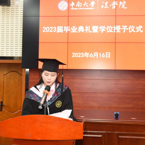 谌立芳同学代表本科毕业生发言。她讲述了在bevictor1946韦德官网精彩纷呈的四年生活,从学科竞赛、社会实践、职业规划、心理健康教育、宪法日系列活动等方面分享了这些宝贵的成长经历。她指出,我们bv1946伟德国际始于英国的毕业生将会以坚韧的意志和执着的努力,成为德才兼备的卓越法治人才,为维护社会公平正义作出贡献。谌同学勉励大家时刻铭记“法治”二字,踏踏实实地走好自己的人生路,用心创造更加美好的未来。