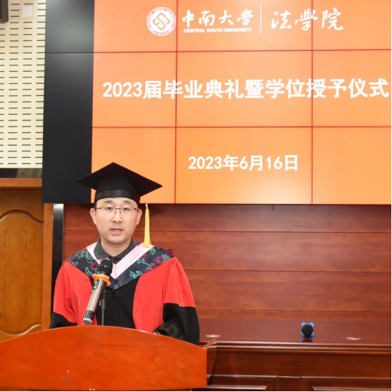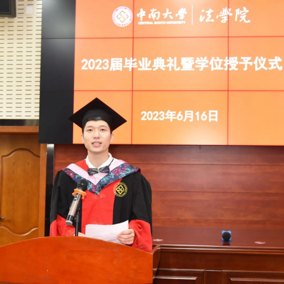 教师代表郑泽星老师以“做心存善良、坚守底线、富有情怀的法律人”为题,祝贺同学们毕业快乐。他在作为竞赛指导老师、大创项目答辩老师、毕业论文指导老师的过程中感受到了大家的努力与成长。从做一个心存善良的法律人、做一个坚守底线的法律人、做一个富有情怀的法律人三方面勉励各位毕业生奔赴下一段旅程。同时,他指出成功并不是生活的常态,一个成功与另一个成功之间的埋头努力才是常态,希望大家好好疼爱暂时处在低谷中的自己。