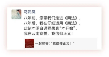 “真诚真的是必杀技!因为老师的真诚和用心所以更想把商法学好! 这就是我真正向往的大学课程的样子,不是千篇一律的ppt,不是和法律无关的吹牛,是每节课都能100%收获到新知识的用心的课堂。”(傅亦涵)