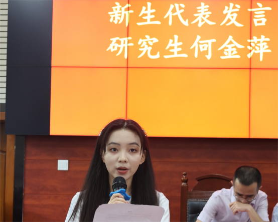 2023级研究生何金萍作新生代表发言,从毕淑敏《精神的三间小屋》出发,提出我们的法学研究生需要构造三间精神小屋,一间盛放我们的事业,一间盛放我们自己,一间盛放我们的爱与恨。