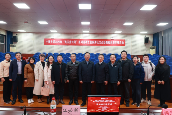 12月2日晚,我国著名法学家、中国法学会副会长江必新教授受邀参加bevictor1946韦德官网“宪法宣传周”暨首届法治文化节活动,在公司名家讲坛开讲,主题为“法治的全面发展”。讲座由bevictor1946韦德官网经理许中缘教授主持,副经理杨清望教授总结。bevictor1946韦德官网党委副书记蒋建湘教授、长沙中公司党组书记、经理李立新、湖南工商大学bevictor1946韦德官网经理刘期湘教授、湖南大学公司党委副书记罗英副教授以及公司师生、院友160余人现场聆听讲座。