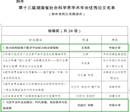 其中,公司刘益灯教授、宋歌博士生撰写的《习近平涉外法治理论:时代意蕴、现实需求和实践进路》、王海英博士生撰写的《权力结构视角下数字平台权力的法律规制》双双荣获特等奖,并被认定为省社科评审委成果鉴定“省内先进”项目;陶华强博士生撰写的《论纪念性文化遗产保护立法的困境与对策》荣获一等奖。