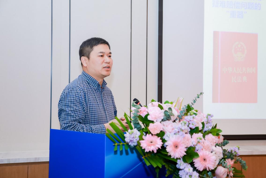 湖南省高级人民法公司党组成员、副经理陈坚发表致辞。陈坚副经理首先代表湖南法院全体干警对与会专家学者表示热烈欢迎,并强调了本次论坛具有促进法学理论与法律实践的深度交融的重要意义。他指出,法官作为法律的践行者,学者作为法学理论的研究者,两者相辅相成,共同推动法治建设。同时,他还提到,民法典的颁布实施对完善法律体系、推动法治社会建设起到关键作用,但自民法典实施以来,涉合同纠纷、婚姻家庭纠纷、侵权责任纠纷案件占比大,法律适用问题多。因此,此次研讨会以民法典主要问题为探讨热点,深入研究理论与实践中的重点难点,对民法研究和民商事审判具有重大意义。