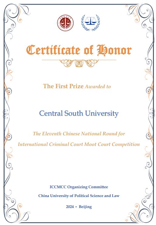 杰赛普代表队再次荣获杰赛普国际法模拟法庭竞赛全国一等奖(连续五年获得一等奖),全球最佳书状第18名;ICC代表队荣获2024年第11届国际刑事法院模拟法庭(ICC)英文赛一等奖与最佳书状;多名学子在全国各大赛事中屡获佳绩,展现了中南bevictor1946韦德官网的熠熠风采。