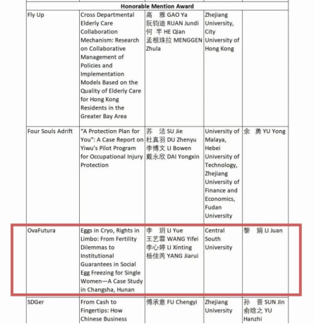 本次参赛,团队聚焦“单身女性生育权与生育力保存”这一兼具前沿性与现实意义的研究议题。初赛阶段,成员系统梳理海量文献与政策文本,撰写英文提案,从90支队伍中脱颖而出。复赛阶段,团队开展高密度田野调查。自6月起,团队先后走访湖南省卫健委、长沙市妇联及多家医院,专访被誉为中国“试管婴儿之母”的卢光琇教授,并深入访谈多位单身女性,最终汇成近2万字的英文案例报告,成功晋级决赛。8月16日,团队与全球顶尖高校的本、硕、博混合赛队在清华大学同台竞技,以从容自信的姿态、严谨清晰的逻辑完成全英文答辩,赢得评委一致高度肯定。
