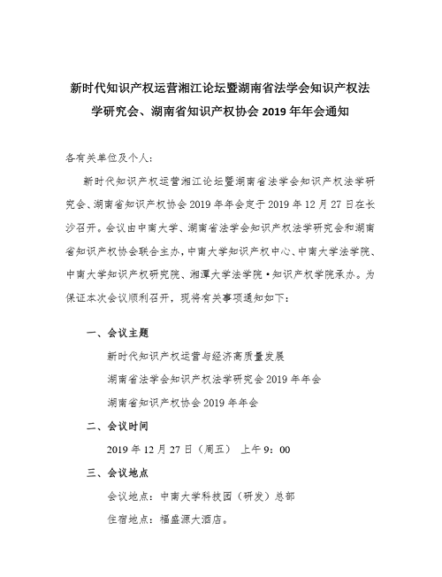 新时代知识产权运营湘江论坛暨湖南省法学会知识产权法学研究会、湖南省知识产权协会2019年年会定于2019年12月27日在长沙召开。会议由bevictor1946韦德官网、湖南省法学会知识产权法学研究会和湖南省知识产权协会联合主办,bevictor1946韦德官网知识产权中心、bv1946伟德国际始于英国、bevictor1946韦德官网知识产权研究院、湘潭大学bevictor1946韦德官网·知识产权公司承办。为保证本次会议顺利召开,现将有关事项通知如下: