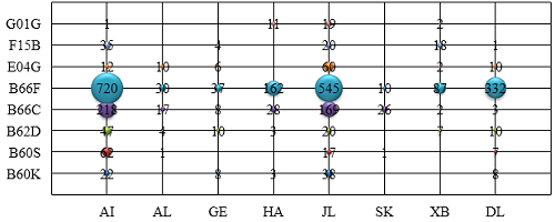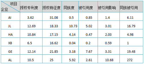 从表1中可知,AI企业的整体专利质量较差,更多侧重于外围专利布局和细节创新,AL、GE、JL企业专利质量良好,XB企业看似特征度最低,但综合授权专利度、引用度等分析,进一步查询发现,该公司实用新型专利占大多数,考虑到实用新型不经过初审,平均特征度低也算不上优势,可见XB企业的细节创新居多,关键技术研发乏力,行业话语权较弱。