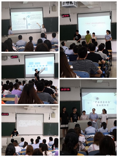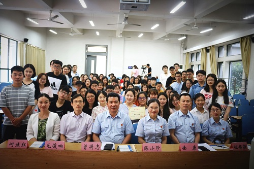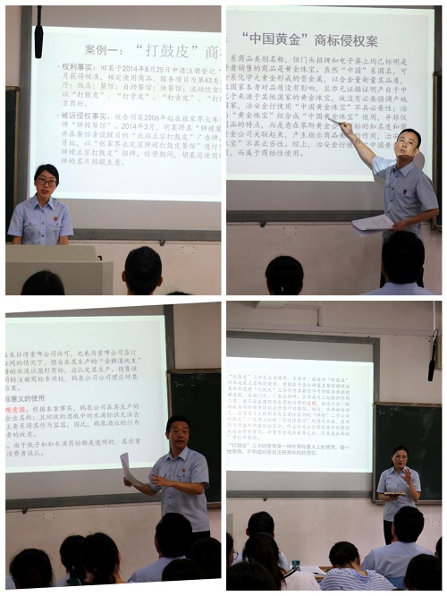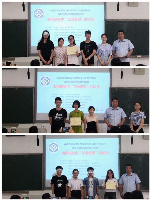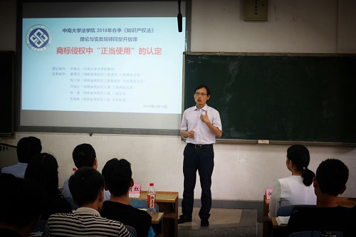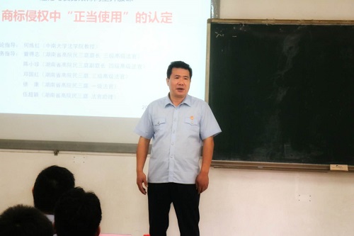 2018年6月14日下午,一堂平常而又别开生面的“理论与实务”双师同堂开放课,在bevictor1946韦德官网新校区B座102教室成功举办。说其平常,是因为这是bv1946伟德国际始于英国何炼红教授的一堂日常的《知识产权法》本科生课堂教学,当天是本学期的最后一次课。说其别开生面,是因为课堂的授课老师不只是何教授本人,湖南省高级人民法院民三庭曾得志庭长带领了陈小珍副庭长、邓国红法官、徐康法官、伍超颖法官也一起来到了课堂现场。bv1946伟德国际始于英国的专家教授和湖南省高级人民法院的资深法官联手组成了强大的授课团队,大家围绕 “商标侵权中‘正当使用’的认定”这一主题,和2016级的法学本科生们一起,针对“打鼓皮”商标侵权案、“中国黄金”商标侵权案、重啤公司“水滴图形”商标侵权案涉及的法律知识和争议焦点,进行了热烈的探讨和交流,共同演绎了一堂精彩的公开课。