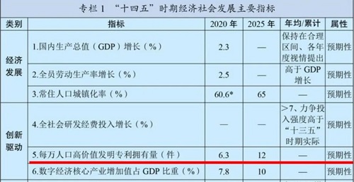 在十四五规划纲要的5方面20个主要指标中,专门为知识产权设置了一项关键性指标(即每万人高价值发明专利拥有量达到12件)