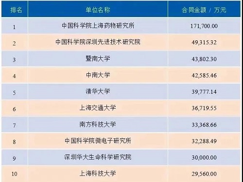 2019年高校院所以转让、许可、作价投资3种方式转化科技成果合同金额前10名