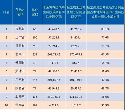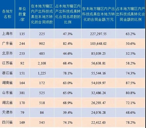 2019各地方辖区内的高校院所以转让、许可、作价投资方式转化科技成果的合同金额前10名