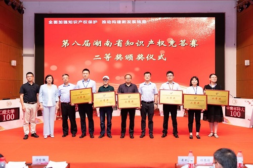 张家界市场监督管理局、永州市市场监督管理局、北京风雅颂专利代理有限公司长沙分公司、中车株洲电力机车研究所有限公司、衡阳师范公司、湘南公司6支代表队获得二等奖。杨翔副经理、左清副厅长、段志雄局长、周科朝副董事长为二等奖队伍颁奖。