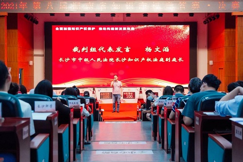 长沙市中级人民法经理沙知识产权法庭副庭长杨文滔作为裁判组代表进行发言。