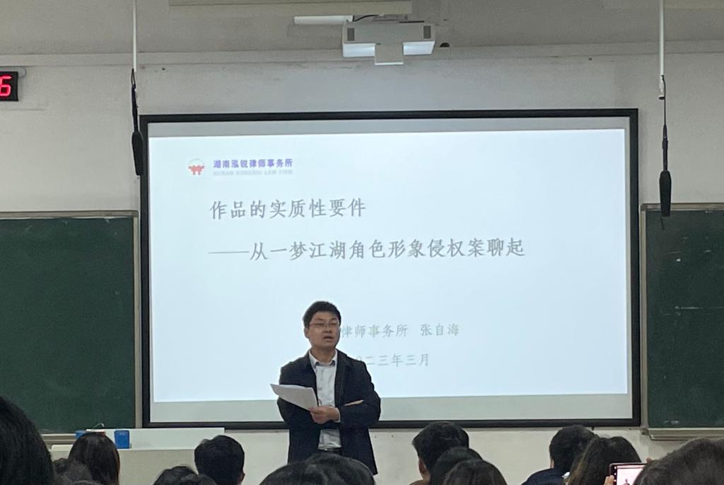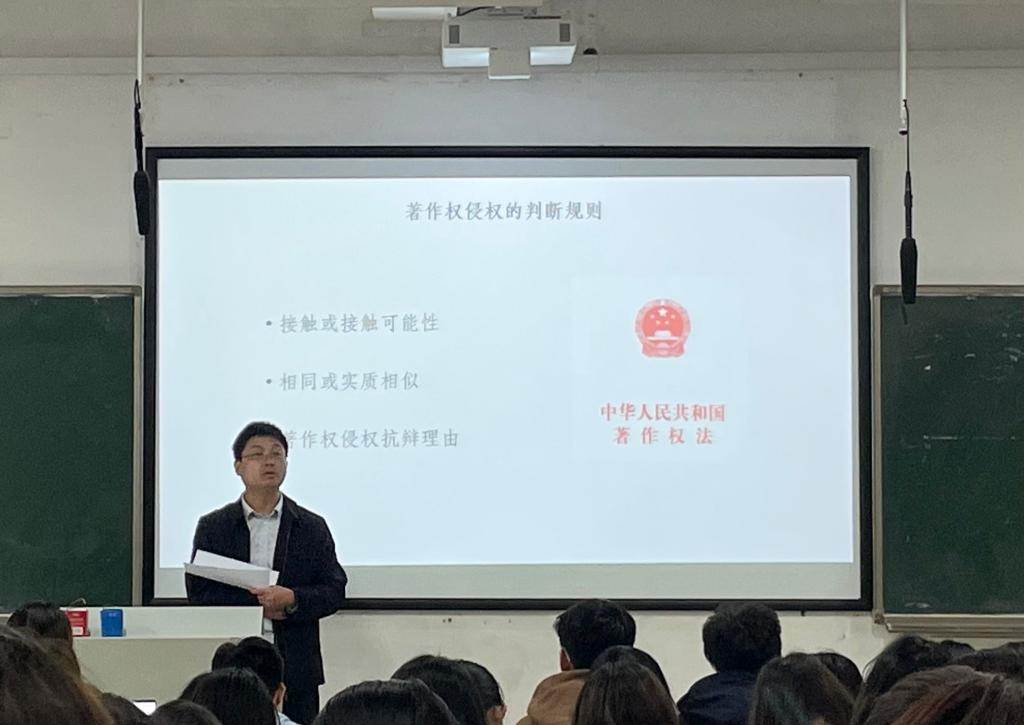 张律师作为“一梦江湖之形象著作权争议案”的胜诉方代理人,为同学们抽丝剥茧由浅入深地分析大数据背景下的网络著作权新兴案件。张律师以“版权登记的角色形象”“被控侵权店铺销售的角色形象”等案件事实为切入点,从“接触或接触可能性”“相同或实质相似”“著作权侵权抗辩理由”三个角度解析了著作权侵权的判断规则。他从法院说理的视角剖析了作品独创性中的“独”和“创”的含义,通过对比一二审法院对独创性认识的异同,帮助同学们更立体地了解二者的含义。最后,他从诉讼请求与应诉策略两方面为同学们传授诉讼过程中的实务经验。