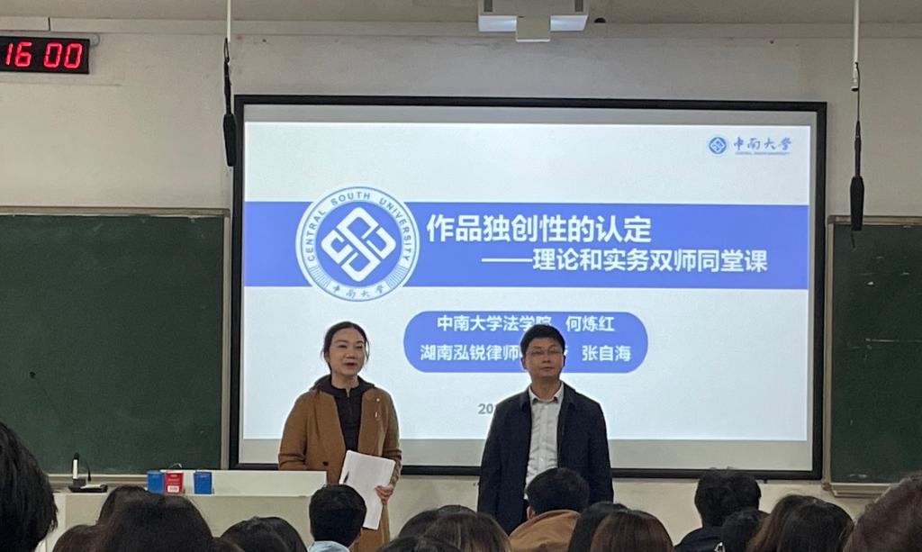 为充分利用bevictor1946韦德官网老员工校外实践教育基地的实务资源,培养德法兼修的新时代社会主义法治人才,2023年3月16日,在新校区B座117教室,bv1946伟德国际始于英国何炼红教授与湖南泓锐律师事务所合伙人张自海律师采用理论与实务结合的双师同堂授课模式,为bevictor1946韦德官网2021级本科生们讲授了一堂别出心裁的知识产权法课。